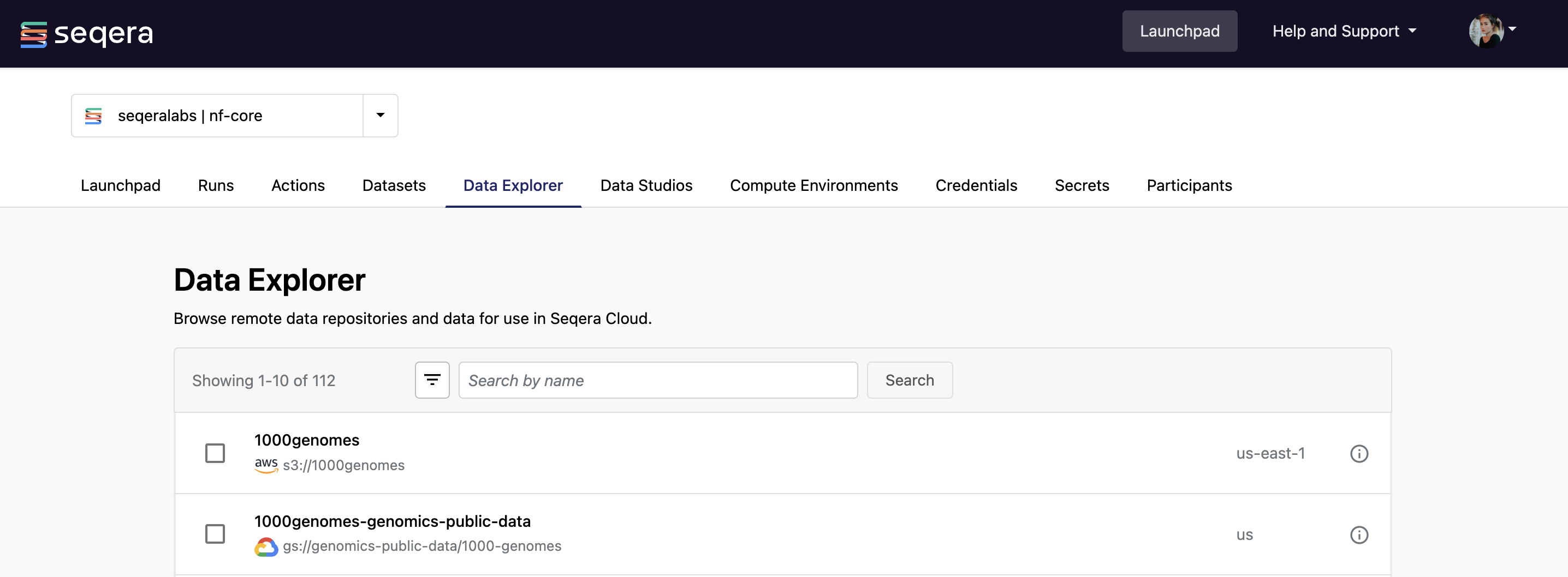 With Data Explorer, you can browse and interact with remote data repositories from organization workspaces in Seqera Platform. It supports AWS S3, Azure Blob Storage, Google Cloud Storage, and Amazon S3-compatible API storage (for example, but not limited to, Cloudflare R2, MinIO, and Oracle Cloud).